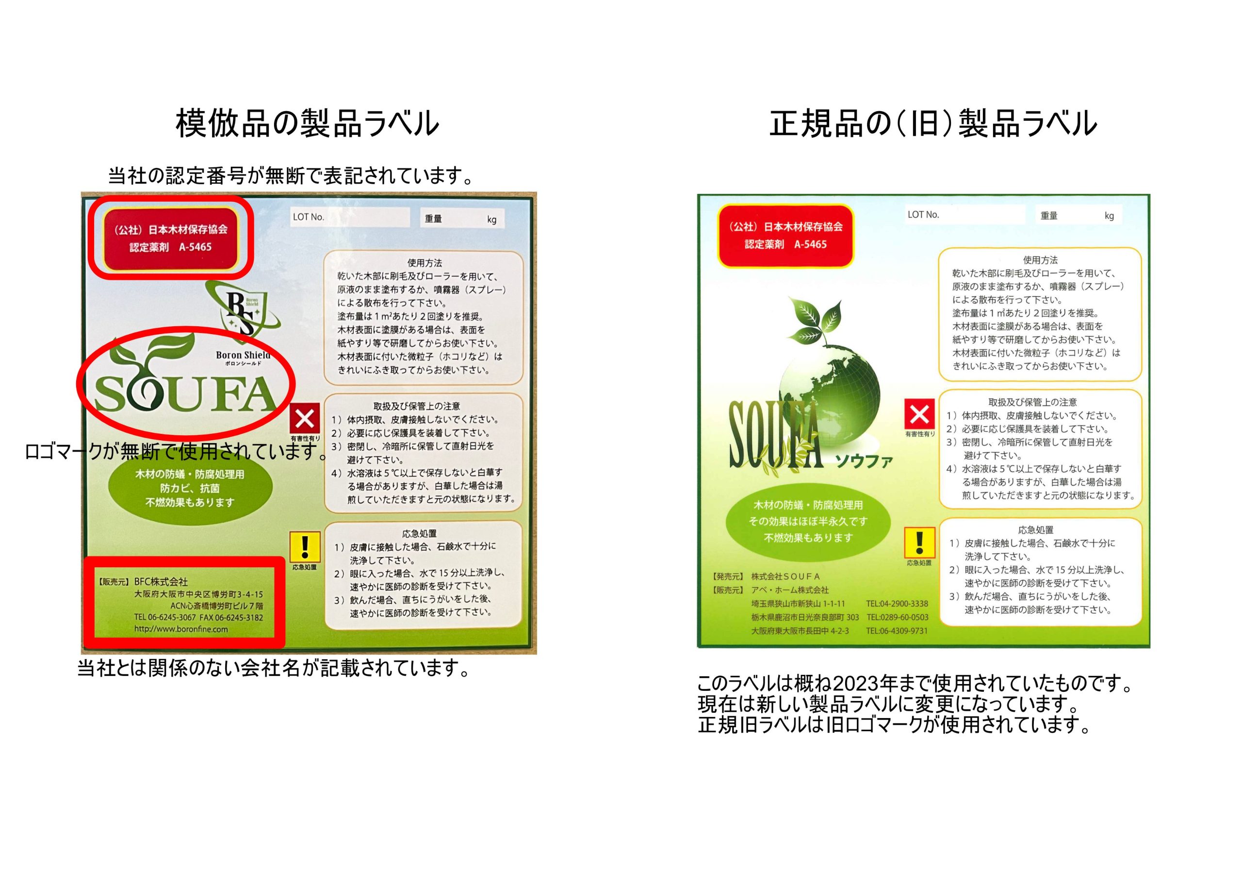 Products manufactured by BFC Corporation have no relationship with SOUFA, so they are naturally not certified products. In addition, anti-termite test data, safety test data, combustion test data, etc. were tested on SOUFA products and are not subject to this. If research, verification, adoption, etc. are conducted based on such data, incorrect information will be provided. Please note that we are not responsible for any damage or accidents caused by the purchase and use of counterfeit products.